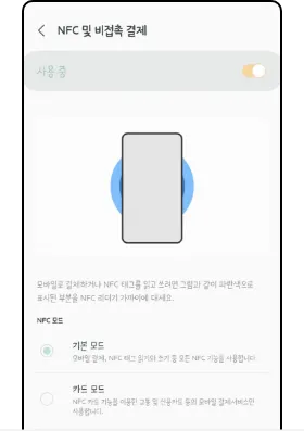 ‘설정 > 연결 > NFC 및 비접촉 결제’에서 NFC 기능을 켜고 기본모드로 설정해주세요. 기본모드에서만 인식이 됩니다.